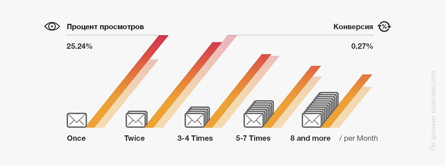 Данные по просмотрам и конверсиям в зависимости от длины цепочки. Оптимальное количество писем – от 2 до 4.